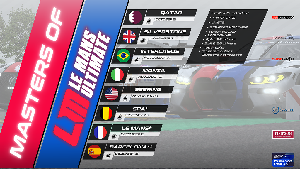 Formula Racing League’s premier championship returns to Le Mans Ultimate and it’s 1hr and 20 min race involving both Hypercars and LMGT3s.