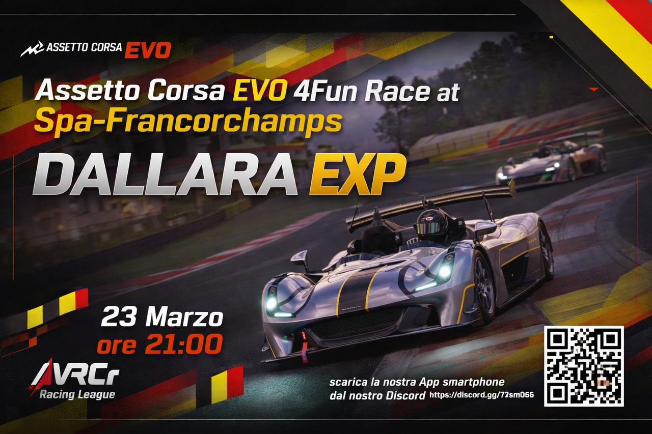 Iscriviti a questa gara 4FUN e scendi in pista con i tuoi compagni di Team, con ben 36 auto monomarca Dallara EXP pronte a sfidarsi tra le curve del circuito belga Spa-Francorchamps!